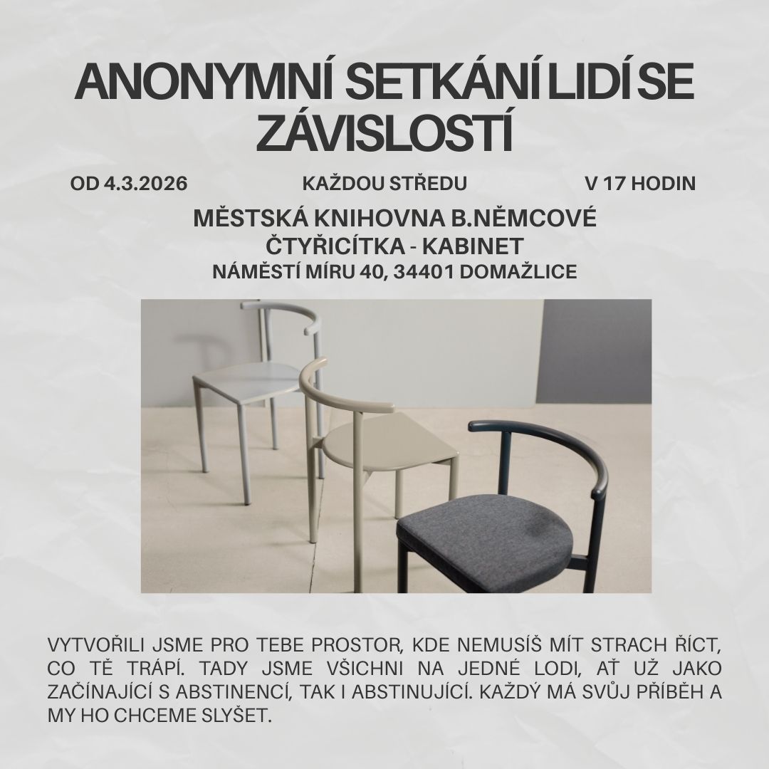 POZOR ZMĚNA! Anonymní setkání budou od 4.3.2026 nadále probíhat v nových prostorách Městské knihovny Boženy Němcové v Domažlicích, Čtyřicítka - Kabinet v čase od 17 hodin.