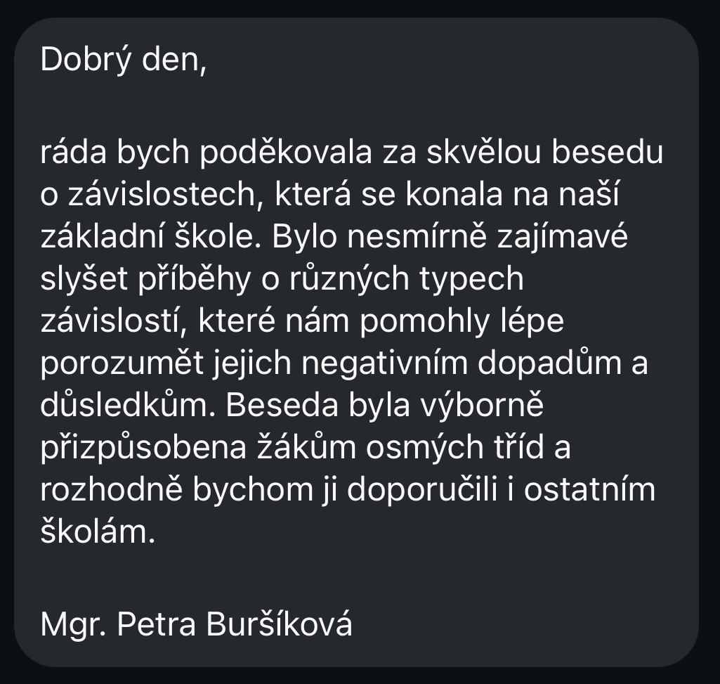 Dne 30.5.2025 jsme měly s Veru Pidaný přednášku na ZŠ v Domažlicích pro žáky 8. ročníku. Povídali jsme si s žáky o tom, jak závislost vzniká, co se děje v člověku, který se stává závislým. Na autentickém příběhu z vlastní zkušenosti Hanky s návykovými látky jsme navedly žáky, aby se tohle téma začalo co nejdříve řešit, pokud mají vlastní zkušenost s návykovými látky a nebo ví o někom, kdo by potřeboval pomoc. Vysvětlily jsme dopad drog na psychiku člověka, jak vypadá běžný den závislého člověka a co všechno se dá v závislosti ztratit. Před přednáškou žáci obdrželi dotazník, abychom věděly, jakou mají představu o návykových látkách. Během přednášky se rozvinula debata o vaporizérech, nikotinových sáčcích, marihuaně a cigaretách. Žáci se aktivně zapojovali do přednášky a bylo vidět, že je velmi zaujal Hanky příběh a dozvěděli se nové informace, které jsme jim předaly.